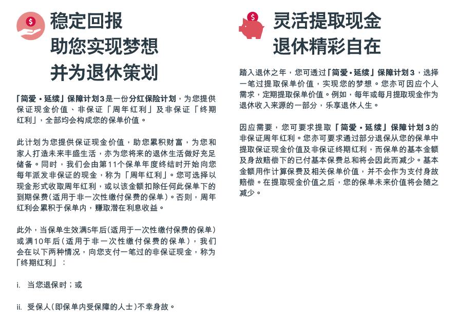 到达人生理想彼岸,您需要前瞻思维和悉心规划。香港友邦保险官网推出「简爱•延续」保障计划3为您提供稳定回报,助您更加轻松筹划未来和实现梦想。您更可于退休时选择一笔过提取现金,实现自己的梦想,或定期提取现金作为退休收入来源的一部分,尽情享受退休生活。有AIA与您同行,您的梦想人生触手可及。