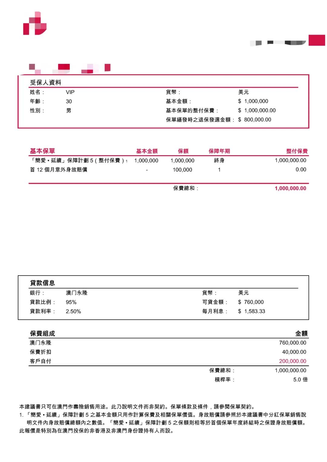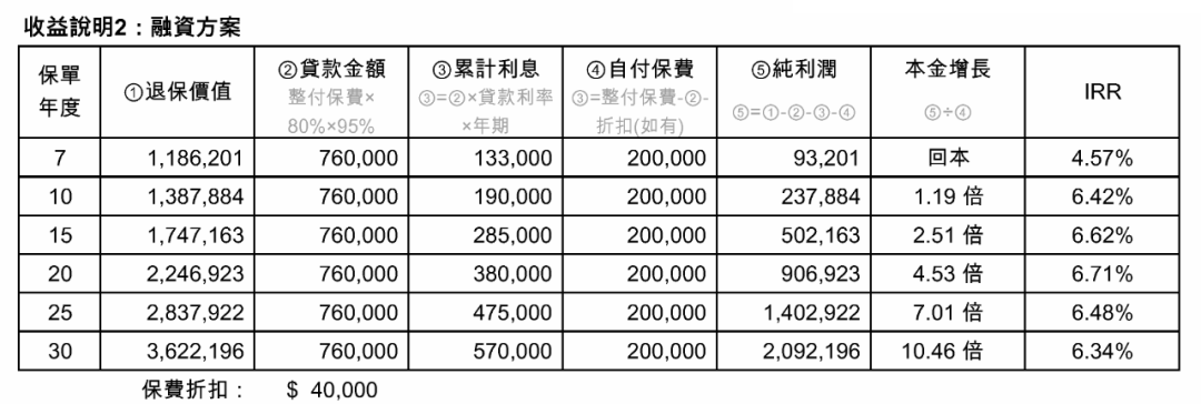 保费融资同理,用1-3成的保费加杠杆,赚取保单收益和银行贷款(以永隆银行为例P-2.75=2.5%)之间的息差。