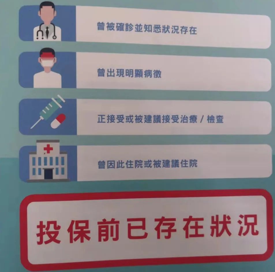 投保前已存在状况”是指受保人在保单生效前曾因任何症状接手或被建议接手治疗,或一个谨慎人士会合理地根据该症状而寻求治疗。这个状况属于“事实”而不是“风险”,此即是“已存在状况”作为不保事项的基础原理。