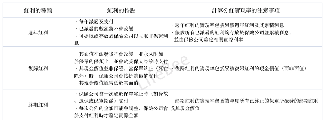 红利一般具有下表中的特点,但实际涵义应以保单合约为准。