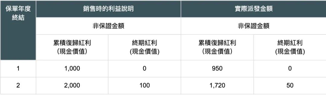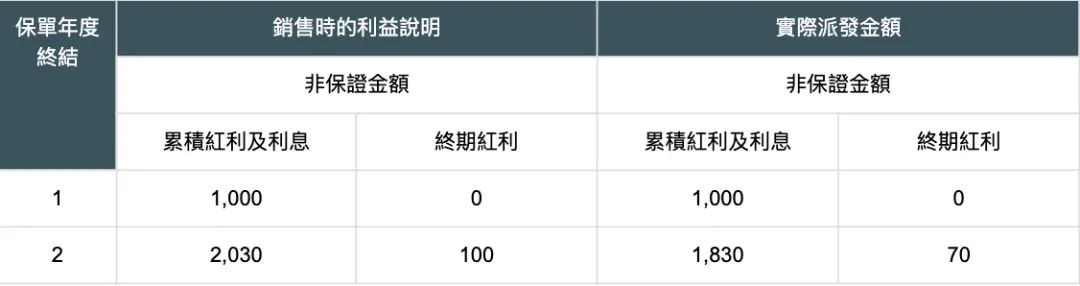 即便两份保单在同一年度生效,每份保单实际派发的非保证利益与销售时所预期的金额之间的差异,亦可能有所不同。