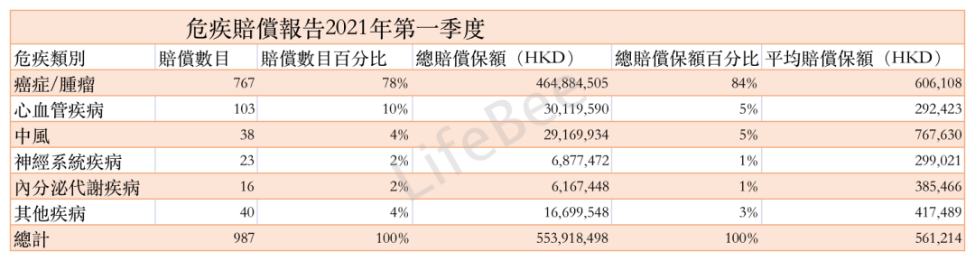 公布了2021年一季度的危疾理赔报告,3个月赔了5.5亿港元