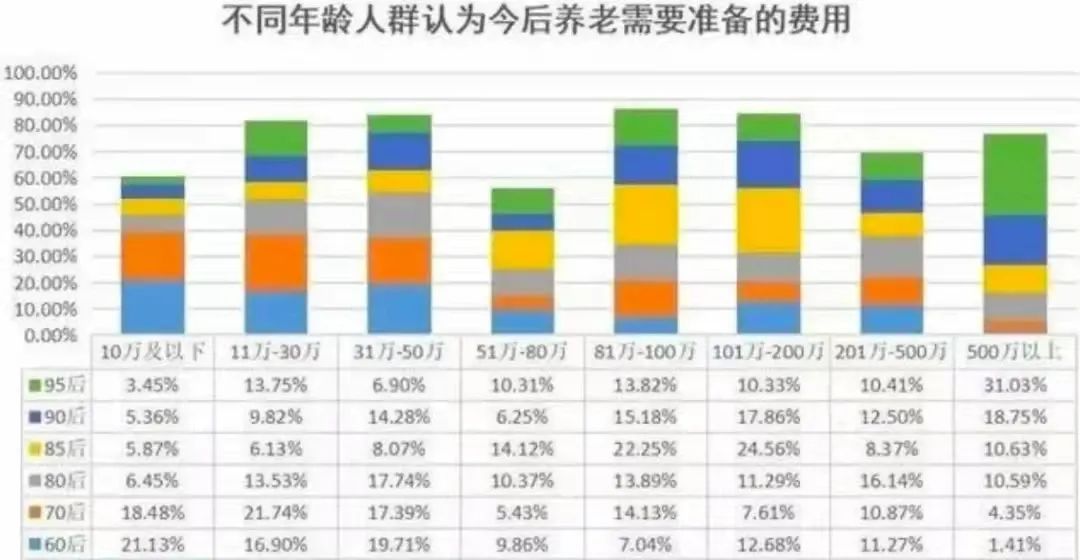 来自《维度》的调查结果显示:75.9%的95后认为自己养老需要50万以上的费用,其中,51.77%的人认为养老费会超过100万,而31.03%的人养老费用更是在500万以上!