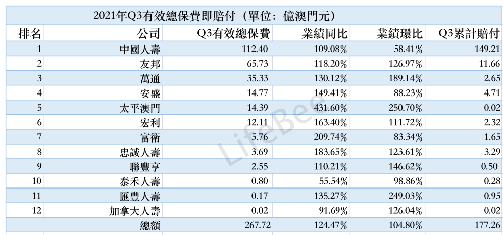 澳门金管局数据显示,2021年1月1日至2021年9月30日前三季度,澳门人寿保险毛保费为