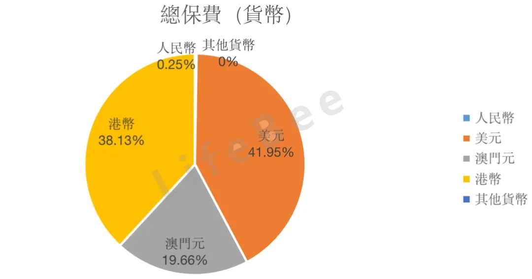 美元保单占比最多(41.95%)、港币单次之(38.13%)、澳门元第三(19.66%);