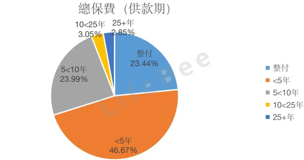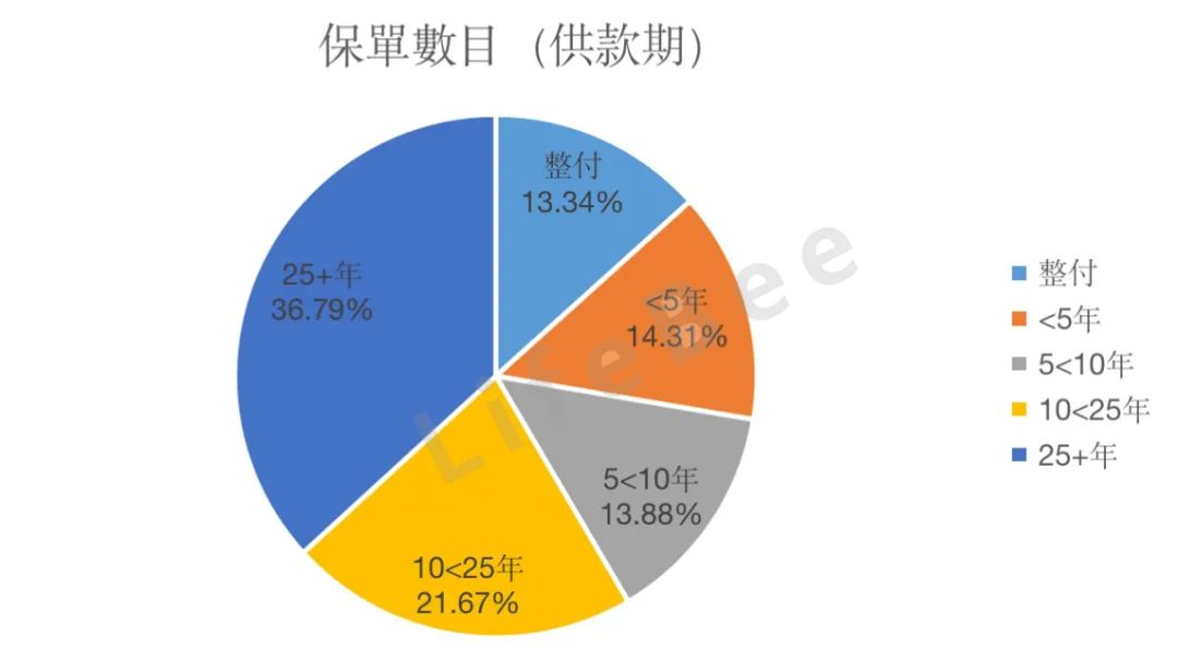 年的保单最多(36.79%)、10<25年的次之(21.67%)、<5年的第三(14.31%);