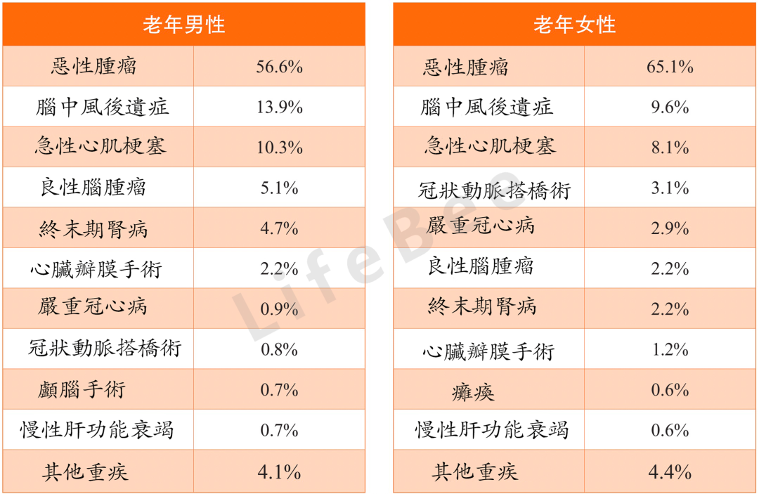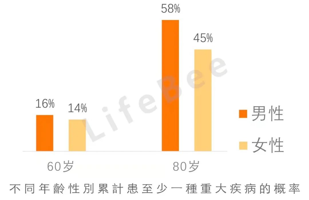 高龄老人的高发重疾还有严重阿尔兹海默病,该病占比在85 岁以上男性中可达 20% 左右,女性达 30% 左右。