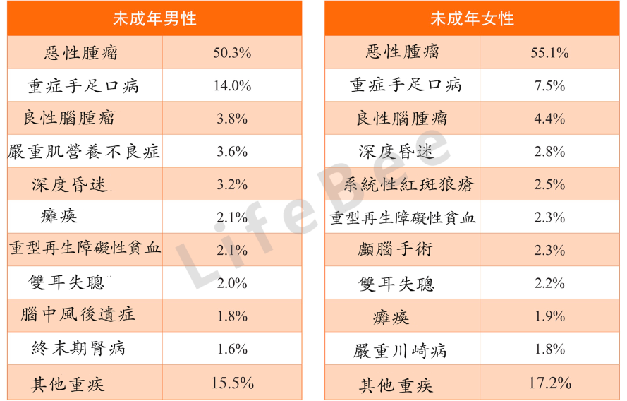 重疾为恶性肿瘤、重症手足口病、良性脑肿瘤,三者合计占比接近 70%。
