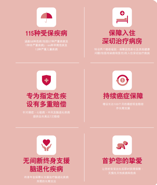 115种受保疾病:涵盖58种危疾(包括57种严重疾病及1种非严重疾病)、44种早期危疾及13种严重儿童疾病