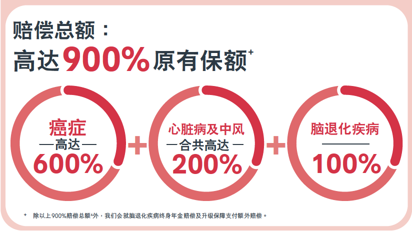 为指定危疾设有多重赔偿:针对癌症、心脏病、中风及脑退化疾病提供合共高达7次赔偿