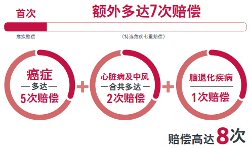 特选危疾七重赔偿:除首次危疾理赔外,为癌症(5次)、心脏病/中风(合共2次)和脑退化疾病(1次)提供额外7次赔偿,总赔偿共8次,每次100%保额。