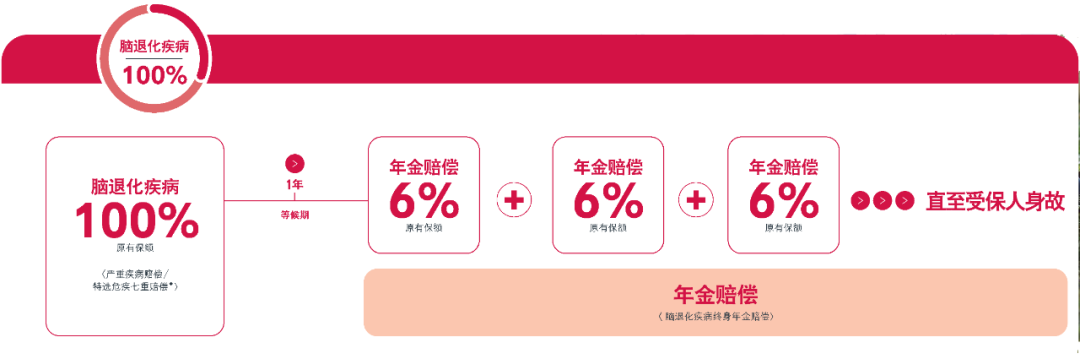 友邦「爱伴航」不仅在危疾多重赔偿中加入了脑退化疾病,更为脑退化疾病提供终身年金赔偿。一旦在重疾或多次赔偿中赔偿过脑退化疾病,且受保人≤85岁、简易脑力测试(MMSE)在10分以下,1年等候期后,每年可获6%现金赔偿(每年需提供受保人在生证明),直至保单终止,提供终身保障。