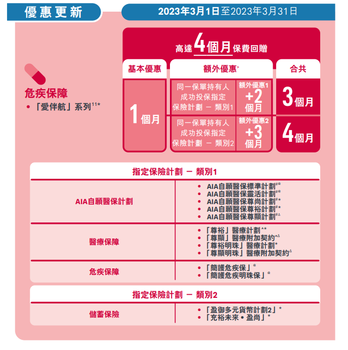 推广日期2023年3月1日-2023年3月31日,投保爱伴航系列,保费回赠1个月,最多保费回赠4个月。