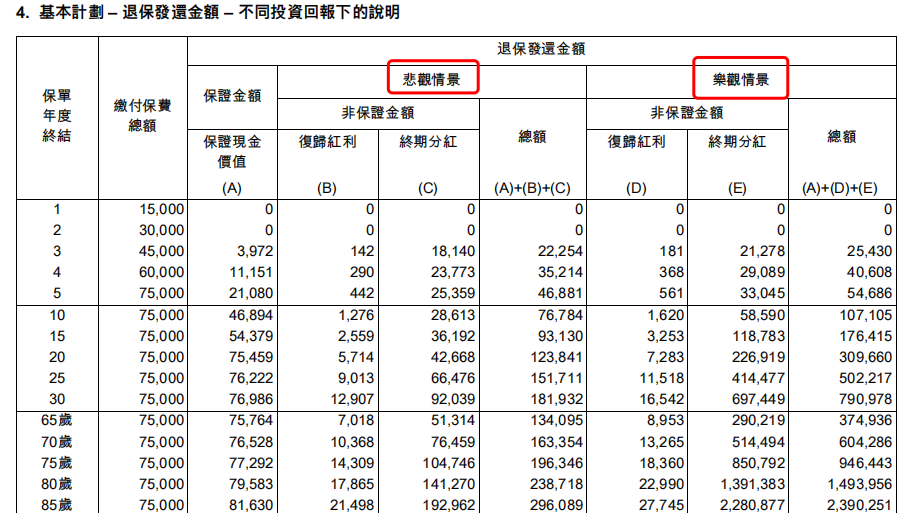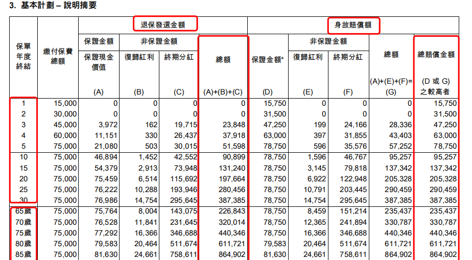 基本计划先展示了正常情况下退保发还金额和身故赔偿额,这个预期回报也是我们日常提到香港保险多少收益、以及计算分红实现率等情况所采用的数据。