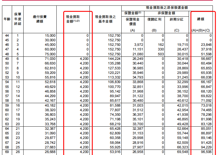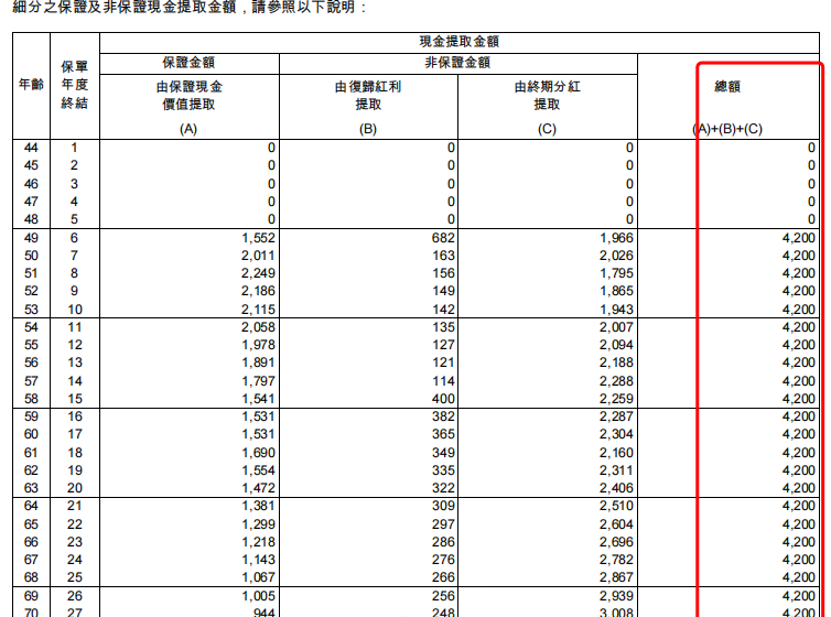 ,在申请计划书的时候有提交领取计划才有,展示了每年领取金额分别从保证金额、复归红利、终期分红中分别提取的金额,以及现金提取后,退保发还金额和身故赔偿额的具体利益。这部分有助于保单持有人提前了解和规划保单现金价值使用方案。以第六年开始每年领取4200美金元的计划书为例: