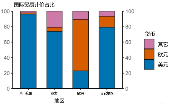 除了欧洲内部贸易以欧元为主,在亚太和其它地区贸易,美元占据绝对优势。