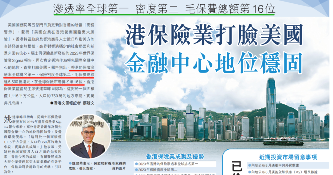 根据香港保监局数据显示,香港保险业的渗透率和密度在亚洲均居首位,而世界二十大保险公司中,就有十二家是在香港营业。这也反映了香港保险业的发达,以及其综合实力在全球排名靠前的地位。