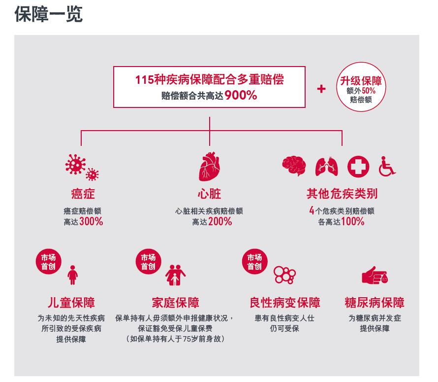 AIA不断突破,致力扩大保障范围,令更多人可以获得保障。因此我们领先市场,提升危疾保障范围,为患有良性病变人士提供癌症保障。此外,为助您应付多方面危疾保障需要,我们更为您提供结合高达保障额900%的多重疾病保障。