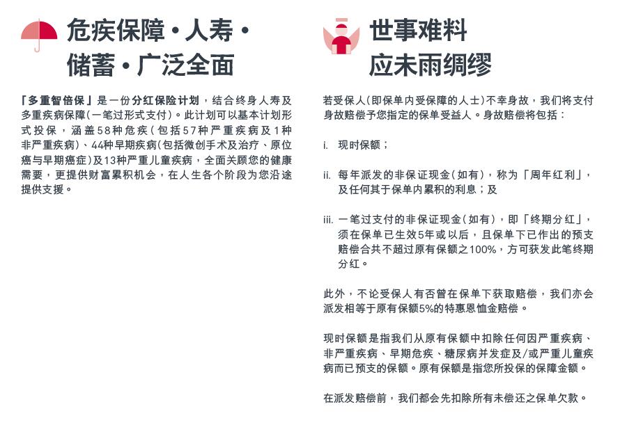 友邦保险推出全新「多重智倍保」危疾保障,结合多重疾病保障、人寿保险及长期储蓄,照顾不同危疾需要,从预防、保障到康复,伴您克服人生路上每个难关。