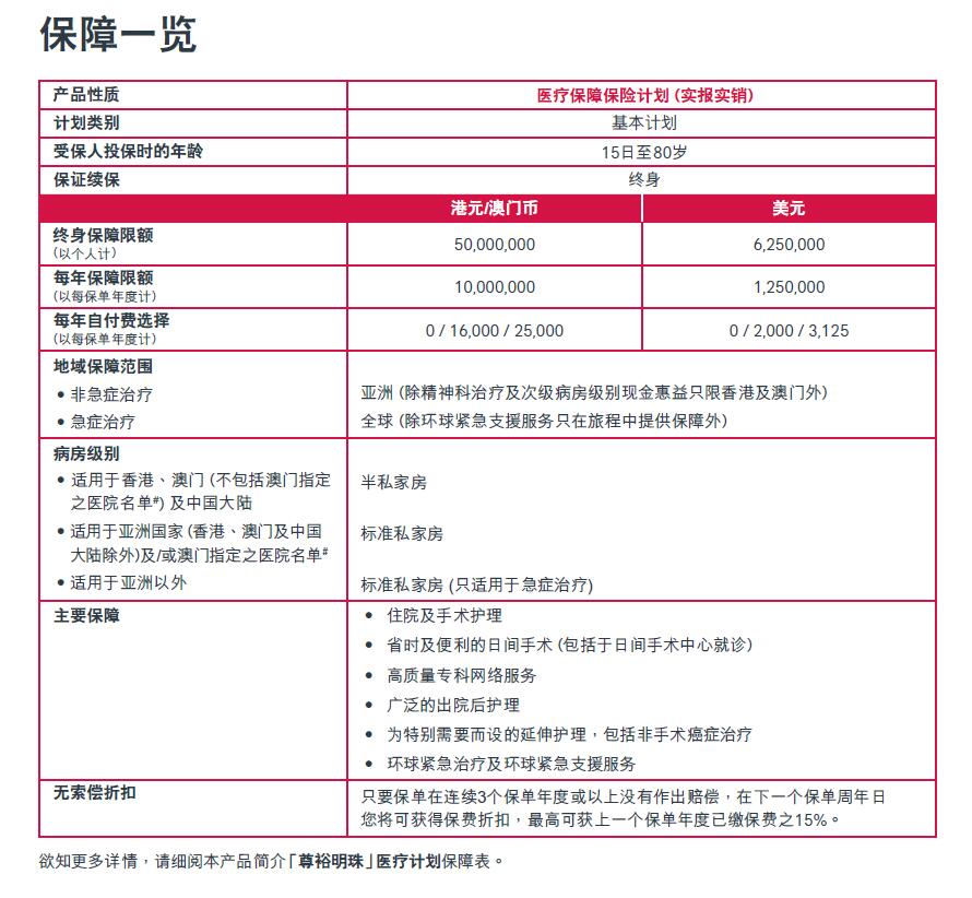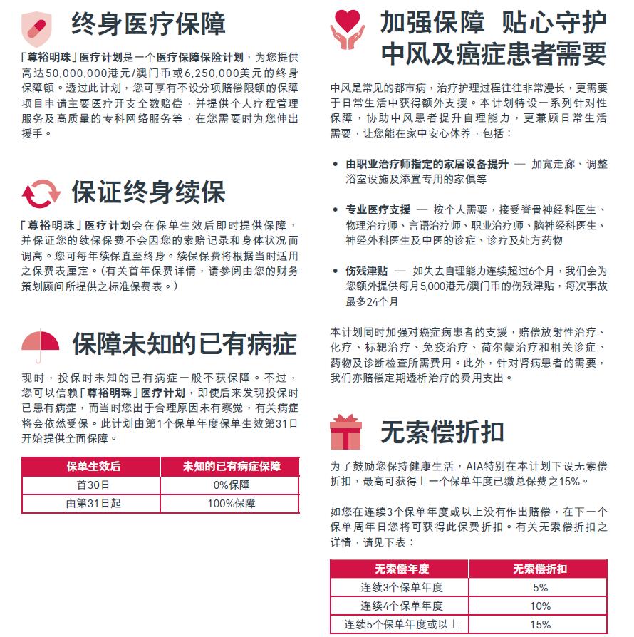 健康体魄是您的最大财富。在成功的道路上,你应选择相应的医疗保障来守护健康。香港友邦保险官网推出「尊裕明珠」医疗计划让您在亚洲地区享有终生保证续保的领先医疗保障,并为您提供专属个人支援,助您进一步实践理想人生。投保「尊裕明珠」医疗计划,您可就不设分项赔偿限额的保障申请主要医疗开支全数赔偿,并享半私家房或标准私家房(视乎住院地区)级别住院保障、非手术癌症治疗全面保障、住院及出院后的延伸护理服务。如我们未曾支付赔偿,此计划会提供无索偿折扣,高达15%保费折扣。